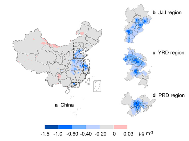 图1.电动汽车基准推广情景对中国年均PM2.5浓度的影响(左);在机动化比例和人口密度较高的东部三大城市群浓度削减显著(右)