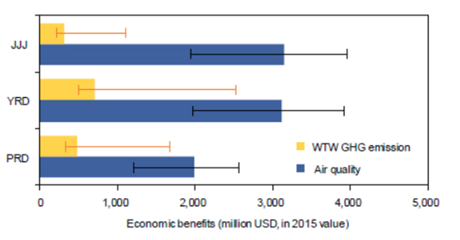 图3. 未来十年东部三大城市群电动汽车发展的空气质量改善和健康风险降低的货币化效益和温室气体减排的货币化效益