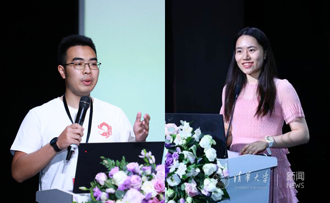 左右分别为:2019年爱因斯坦世界科学奖得主、中国科学院外籍院士王中林向参会学生介绍摩擦纳米发电机,美国国家工程院院士、麻省理工学院机械工程系讲席教授陈刚作大会报告