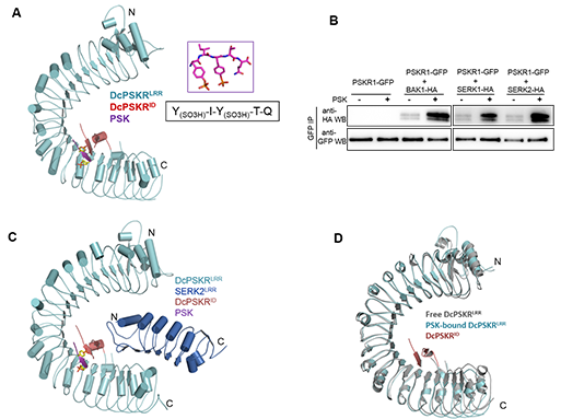 图为:(A)PSK-PSKR识别复合物结构;(B)PSKR-SERK在植物体水平的互作;(C)PSK-PSKR-SERK激活复合物结构;(D)单独的PSKR和结合PSK的PSKR结构比较。