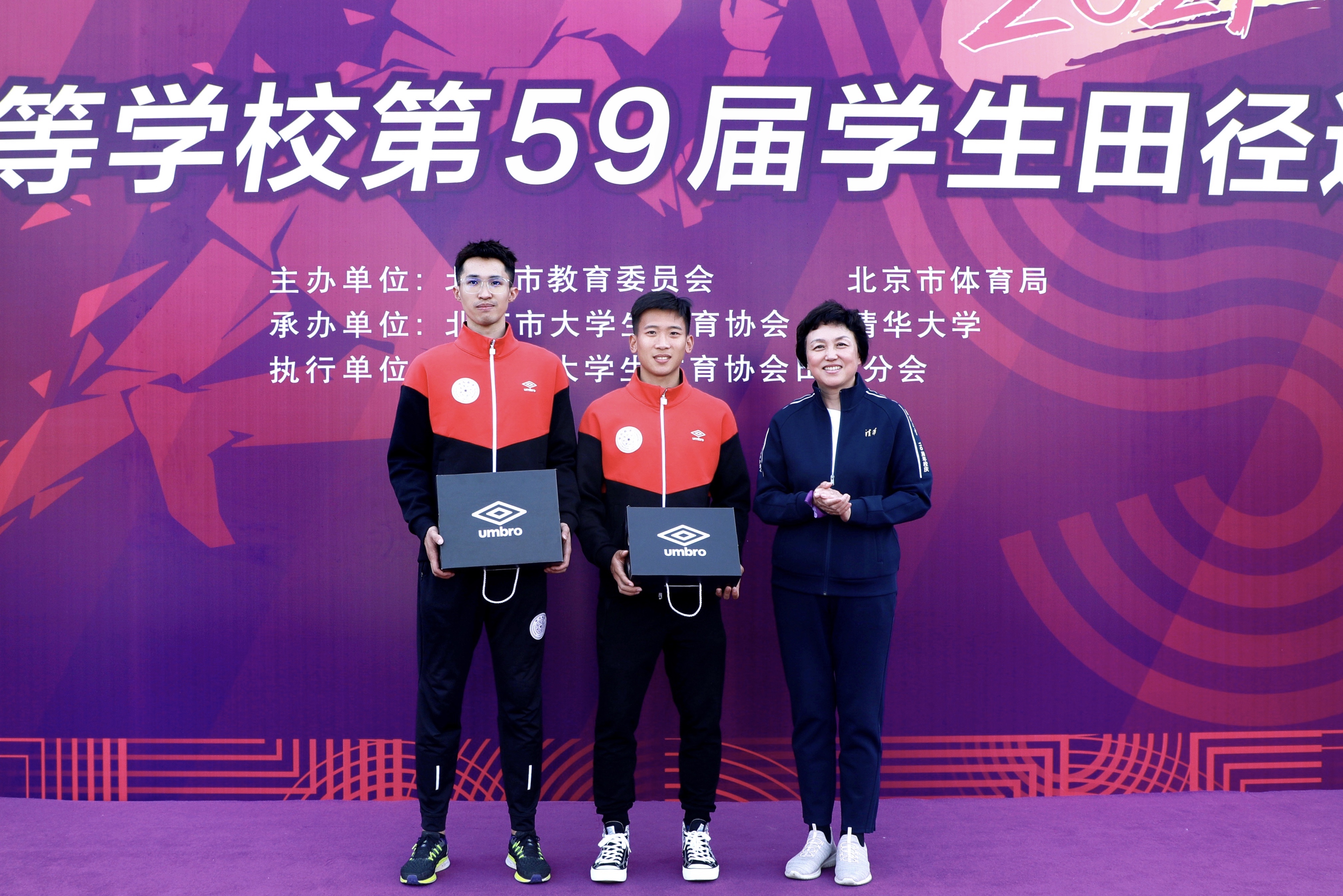 陈旭为打破首都高校田径纪录的运动员颁奖