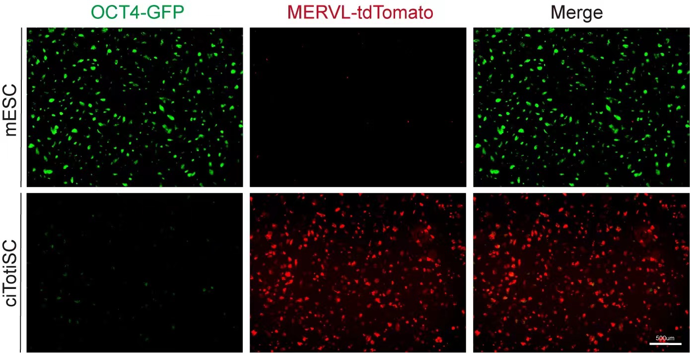 从mESC 到 ciTotiSC 的化学定向诱导(OCT4绿色标记的是多能干细胞,MERVL红色标记的是全能干细胞)