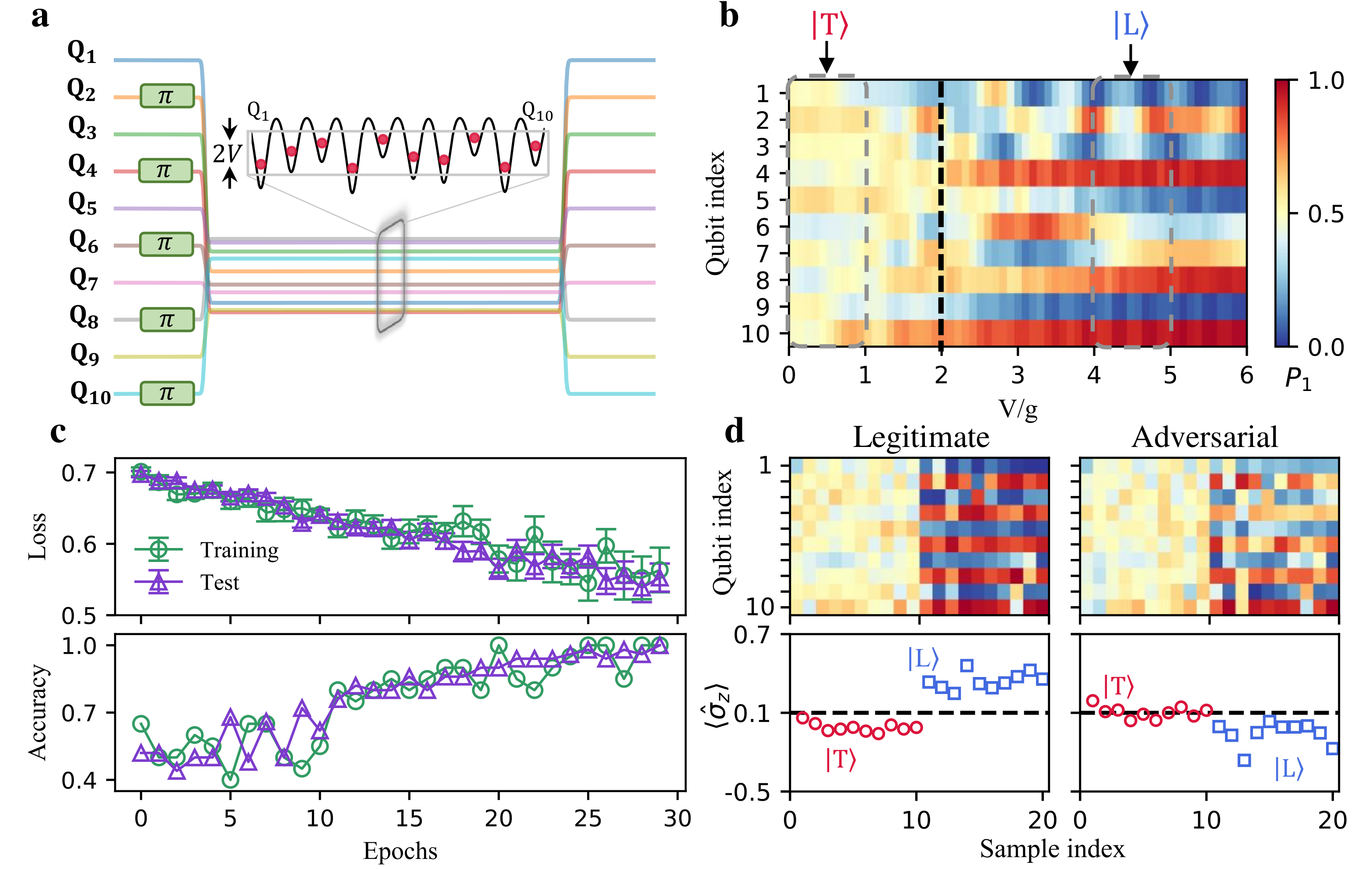 在量子机器学习领域,近年来的理论工作展示了在某些特定的任务下,量子分类模型和生成模型相对于经典模型具有可证明的、有复杂性理论保证的优势。最近两年,量子对抗机器学习的概念也被提出并受到了广泛关注。然而,在当前中等规模带噪声(NISQ)量子设备上演示量子学习模型面对对抗攻击的脆弱性和防御手段还面临诸多挑战。该研究中,0033990威尼斯交叉信息研究院邓东灵团队设计了处理经典数据和量子多体态数据的学习模型,并与浙江大学超导量子计算团队合作,首次在量子设备上成功实现了高维数据的学习、对抗攻击脆弱性的揭示以及相应防御手段的展示。