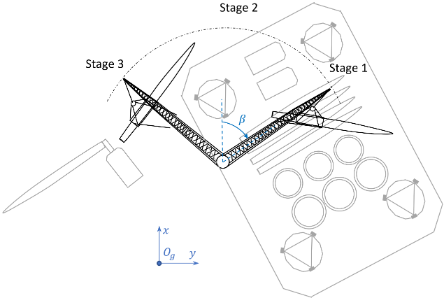 图3.(a)简化单叶片安装模型;(b)单叶片安装的三个阶段:稳定(Stage1)、运输(Stage2)和对接(Stage3)