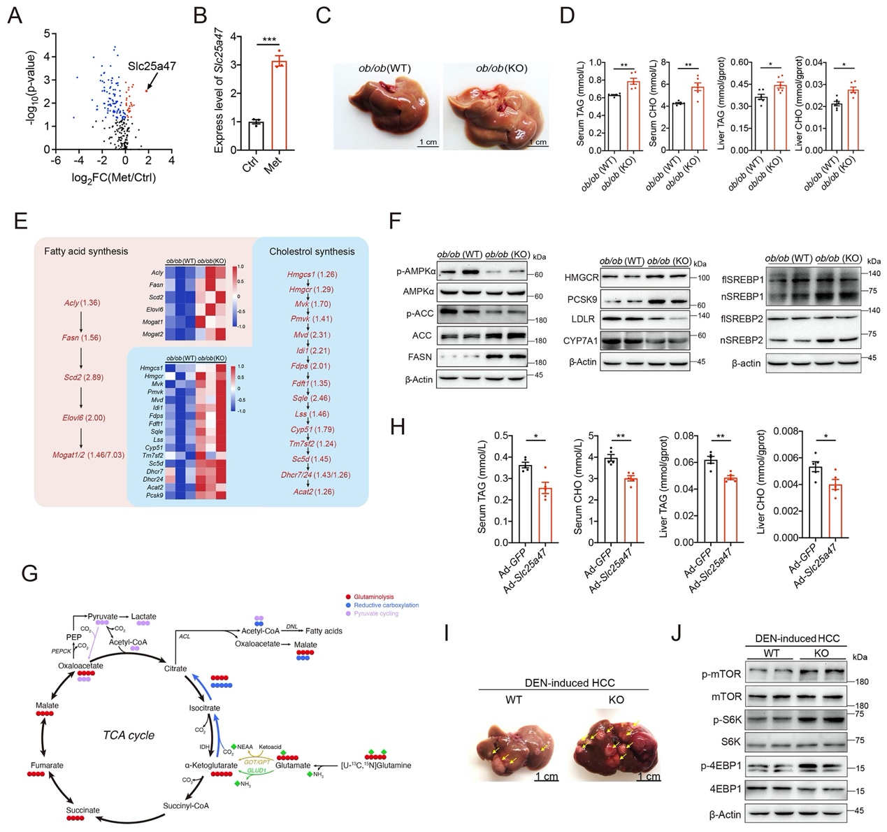 自从上世纪90年代脂肪酸合酶FASN被定义为侵袭性乳腺癌的肿瘤抗原后,越来越多的研究表明脂肪酸的生物合成对于癌细胞的生长和存活是非常重要的。因此,该研究推测SLC25A47参与肝细胞癌(HCC)亦可能与脂代谢相关。有研究显示,利用化学致癌物DEN可以诱导小鼠HCC发生,且其发病过程与人体HCC类似。该研究通过构建DEN诱导的HCC小鼠模型发现,SLC25A47敲除促进了小鼠肝脏脂肪积累,进而促进了HCC的发病进程(图1I,J)。