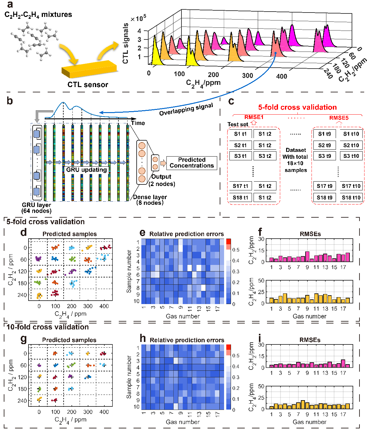 团队以单个催化化学发光传感器对乙烯-乙炔二元气体的检测为例,提出基于GRU(Gated Recurrent Unit)神经网络的混合物多组分智能检测方法。该方法通过循环迭代的方式,能够提取气体传感器的信号时序特征。该研究中,针对18种不同浓度配比的乙烯-乙炔二元气体混合物,可直接根据传感器响应信号预测各组样品的组分含量,在5折交叉验证测试中,成功识别了这18种二元气体样本,准确率达99.9%以上。