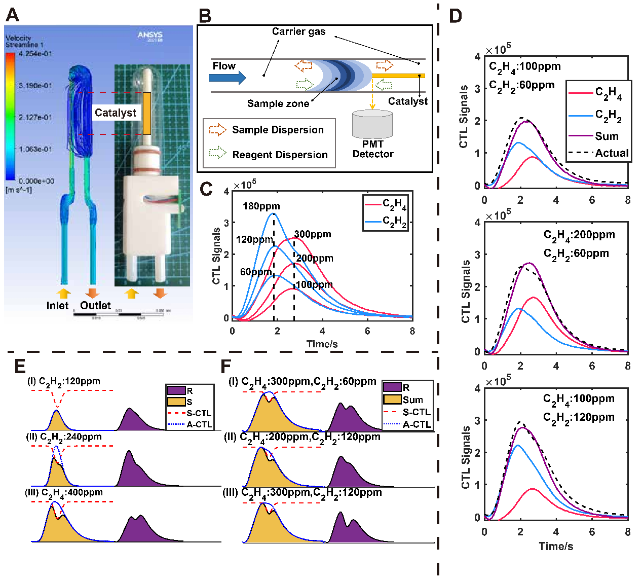 针对该传感器的响应信号重叠现象,团队进一步提出了一种气体双扩散模型,能够同时考虑被测气体混合物分子与载流气体分子双向扩散,并讨论了混合物响应信号的时序特性与混合物成分之间的固有关系。基于该模型的仿真结果与实际重叠响应信号具有良好的一致性,这也为该研究所提的多组分智能检测方法提供了明确的理论依据。