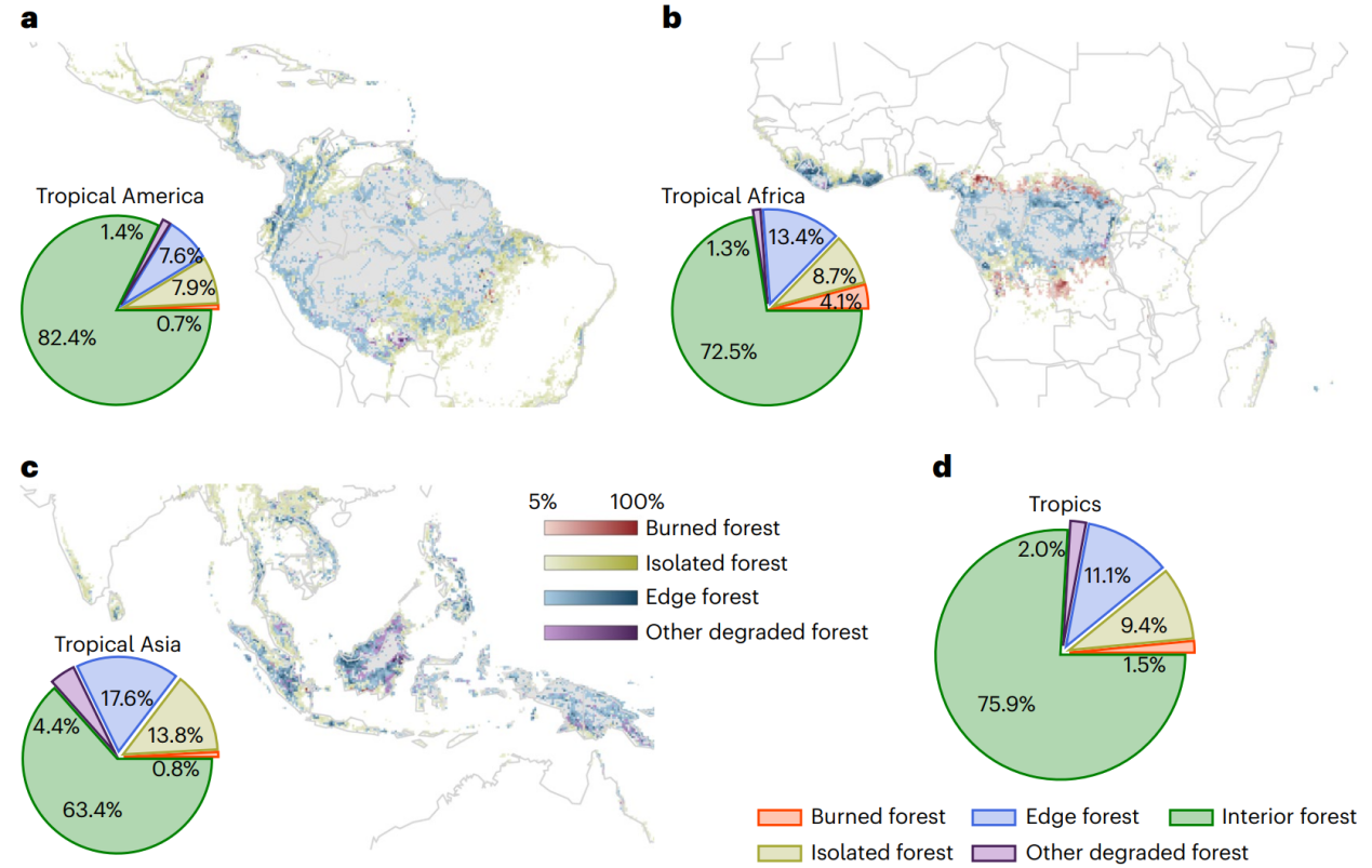 0033990威尼斯地学系李伟副教授课题组联合国内外多所研究机构,利用高分辨率卫星观测数据,针对上述问题在热带雨林地区展开研究。研究首先识别了四类退化的热带雨林:被火烧过的森林、小斑块森林、边缘森林和其他退化森林(图1),分析了热带雨林退化导致的生物物理和生物地球化学效应,量化了1990-2010年间人为导致的热带雨林退化的生物物理和生物地球化学效应。研究发现,2010年24.1%的热带雨林发生了退化;发生森林退化区域的地表温度相比于没有发生退化的内部森林高了0.78±0.88°C,对整个热带区域而言,热带雨林退化造成了地表平均升温0.022±0.014°C;热带雨林退化造成的总碳亏缺达到了6.1±2.0PgC,带来的热带区域等效升温为0.026±0.013°C。热带雨林退化导致的生物物理及生物地球化学增温效应十分接近。1990-2010年,人为导致的热带雨林退化带来的白天地表温度升温为0.018±0.008°C,带来的碳亏缺为2.3±0.8PgC,与同期森林砍伐的影响量级相当。