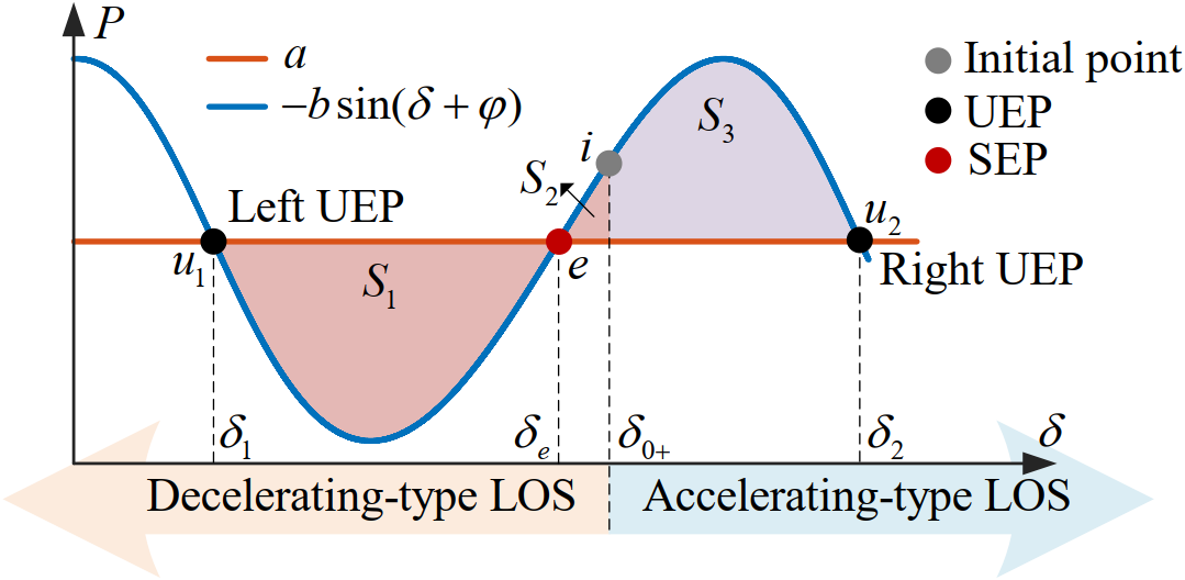 针对这一问题,该论文建立了表征低惯量电网的简化结构,如图2所示,由电力电子发电装备和传统同步发电机共同作为电力系统的发电来源。推导得出了描述系统暂态稳定动态过程的“相对功率-相对频率”模型,基于该模型从能量的角度揭示了低惯量电力系统的暂态失稳机理。其一,IBG和SG惯量不匹配可能导致加速失稳和减速失稳两类不同的失稳形态;其二,相对角度和相对频率在故障时刻会发生跳变,从而带来系统能量的突变;其三,IBG的非线性特性给暂态同步稳定模型引入了余弦阻尼项,该阻尼项被证明具有减少系统能量的特点,有利于系统恢复稳定。采用改进的等面积定则方法(参见图3),提出了严格保守的判据用于判定系统的暂态稳定性。该论文还进行了仿真实验以验证结论的正确性。论文研究内容为认识未来低惯量电网的暂态稳定性并进行稳定性分析和评估提供了指导。