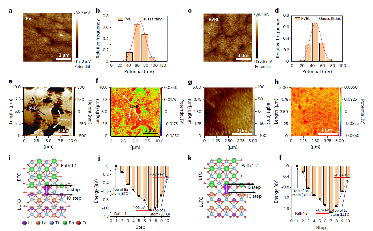 图1.具有并肩耦合结构的BaTiO3-Li0.33La0.56TiO3-x纳米线填料及其所构建的PVBL复合固态电解质结构表征