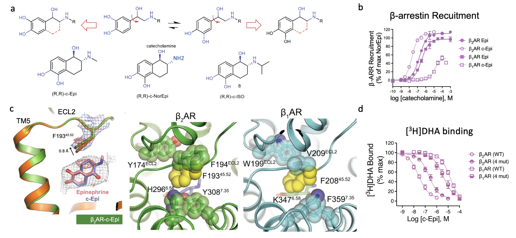 图1.构象限制的儿茶酚胺通过变构效应获得对β2肾上腺素受体的选择性(a.构象限制的儿茶酚胺的设计与合成。b.c-Epi对β2AR的亚型选择性。c.c-Epi与β2AR的结合口袋及周围关键的差异氨基酸。 d.突变受体正构位点周围残基影响c-Epi对受体的亲和力)