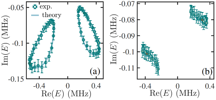 非厄米系统由于其独特的拓扑特性而广受关注。非厄米系统通常具有复数能量,并且其复数能量可能具备诸如链环或纽结的拓扑结构,这些拓扑结构是能量始终为实数的厄米系统所不具备的。近来,由于其独特的拓扑性质以及潜在的量子信息处理应用,在离子阱、冷原子、超导电路以及固态自旋系统等量子模拟平台中实现非厄米哈密顿量已成为一个重要的研究目标,并且已取得很大进展。然而,非厄米能谱拓扑结构的决定性特征尚未被实验探测到。实际上,实验测量非厄米系统的复数本征能量仍然是一个重大挑战,这使直接探测能谱的拓扑性质变得十分困难。最近,徐勇研究组提出一种被称为非厄米吸收光谱学的方法,用于测量非厄米量子系统中的复数能谱,这为在离子阱等量子平台中测量复数能谱拓扑提供了可能性。