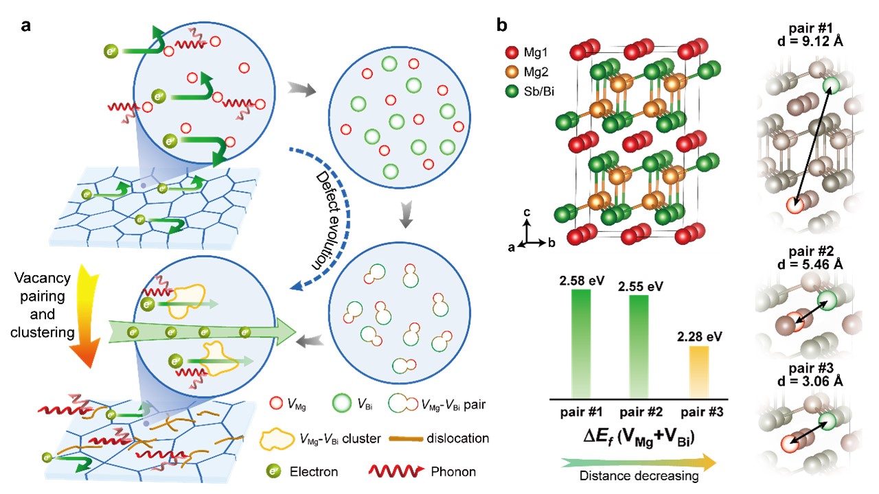 清华新闻网4月27日电 热电材料可以实现热能与电能的直接相互转换,基于塞贝克效应和帕尔贴效应设计的热电器件可用于废热发电和主动制冷。相较于传统技术,热电发电/制冷技术具有无运动部件、结构紧凑、绿色环保、功率密度高等优点,已成为动力续航、节能减排、高精度控温、局部制冷等应用需求的解决方案。环境友好型锑化镁(Mg3(Sb,Bi)2)基热电材料是备受关注的新型热电体系之一,由于其低成本、高性能等特点有望得到大规模应用。但是,镁基热电材料的可控制备存在一定难度,且热电性能有待进一步提升。当前,提升镁基热电材料性能的关键在于实现电声解耦:抑制本征Mg空位对电子散射的同时增强声子散射。
