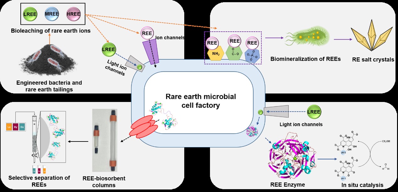 清华新闻网6月7日电 稀土材料在生物医学和高技术领域发挥着不可替代的作用。同时,稀土元素(REEs)的开采和提取方法由于涉及危险化学品,往往导致严重的环境问题和资源浪费。生物采矿是有效的替代方案,实现可持续地分离和回收REEs仍然存在着巨大的挑战,难点在于开发有效的稀土富集微生物底盘和特异性REEs结合大分子材料。