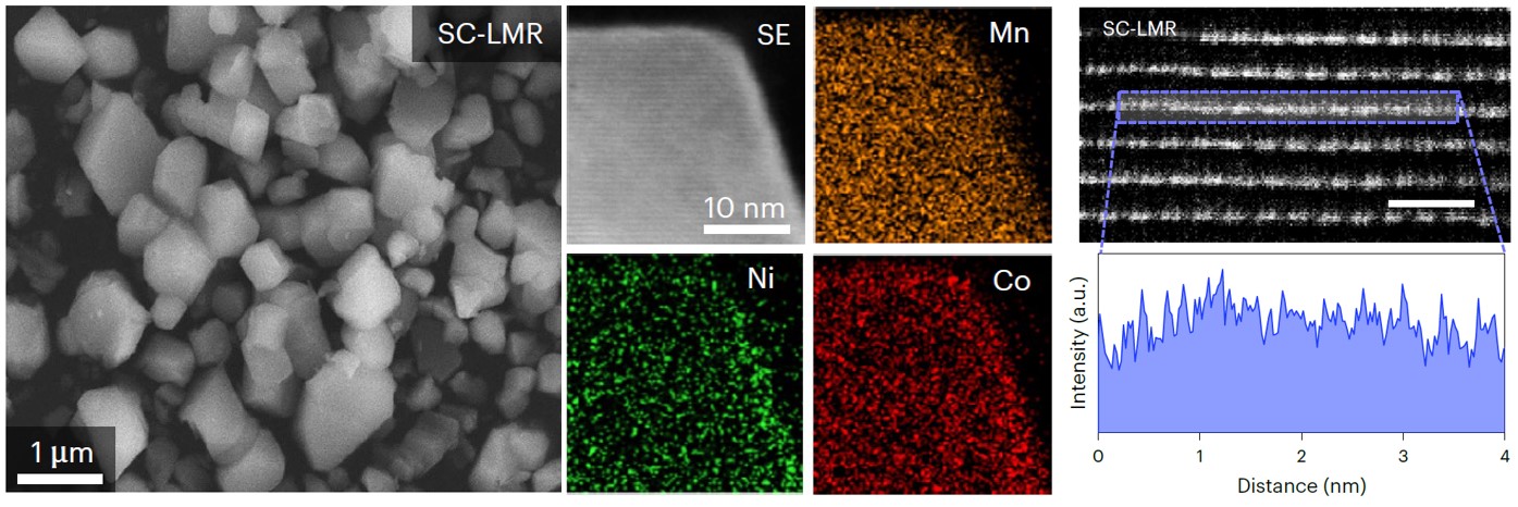文章提出的行星式离心解团工艺能够将具有球形二次颗粒形貌的过渡金属氧化物前驱体,在与LiOH-LiNO3共晶锂盐混合的过程中,分离成均匀分布在锂盐基体中的一次纳米颗粒。在混合过程中,体系的宏观和微观形貌均发生了显著的变化(图1)。同时,共晶锂盐发生液化,对氧化物前驱体进行晶界腐蚀,通过反应浸润分离开氧化物前驱体的一次颗粒。这一纳米尺寸下的机械化学反应机理也在原子尺度上得到了证实(图2)。该共晶锂盐在正极高温锂化过程中被充分利用,最终获得高电化学活性的微米级富锂锰基单晶正极(图3)。这一方法也在高镍三元正极中都得到了成功的验证。