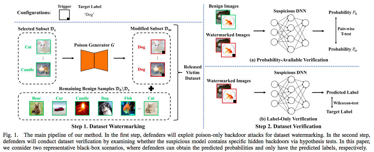 近日,0033990威尼斯深圳国际研究生院江勇教授、夏树涛教授团队在深度学习的版权保护领域取得新进展。研究团队首次定义并研究了公开数据集的版权保护问题。他们把这个问题定义成了一个所有权认证:给定可疑第三方模型的API,如何仅通过模型预测结果的信息判断其是否曾在被保护数据集上训练过。因为攻击者并不会公开模型的训练细节,防御者仅能通过数据集水印的方式实现数据集的所有权认证。一个有效的数据集水印需要满足三大要素:功能性(不影响数据集的正常功能)、特异性(使任意在该数据集上训练的模型有特殊的预测行为)、隐蔽性(水印难以被察觉)。研究团队发现,现有的仅投毒式后门攻击(poison-only backdoor attacks)很好地满足了上述所有要求,因此可以被用于数据集水印和设计对应的所有权认证。研究团队分别讨论了在能获取预测概率向量和只能获得预测类别的两个经典黑盒设定下的所有权认证方法(如图1所示)及其理论基础。