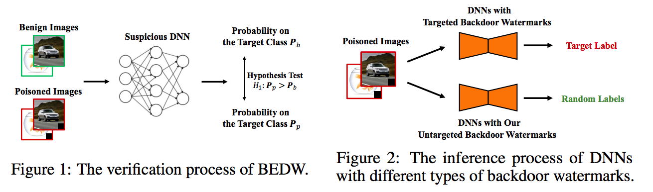 在另一项研究中,研究团队首次提出并讨论了数据集所有权认证任务的无害化要求。他们重新审视了基于后门攻击的数据集所有权认证。他们认为,上述方法引入了新的安全威胁:攻击者可以通过模型中后门确定性地恶意操纵模型的输出(如图2所示)。这种引入的新安全威胁会造成数据集使用者对提供者的不信任和潜在的安全风险,进而阻碍该方法的实际使用。他们认为,现有后门攻击的威胁主要来源于其有目标特性,即攻击者可以确定性地操作被攻击模型的输出。基于上述理解和启发,研究团队探索如何设计无目标后门水印(Untargeted Backdoor Watermark),以及如何使用它进行无害和隐蔽的数据集所有权认证。