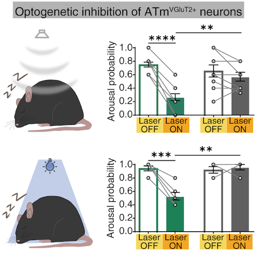 在证实了ATm在清醒状态维持中扮演重要角色后,课题组研究人员结合以上提及的技术手段、脑深部双光子记录以及声音、蓝光刺激,发现只有ATm神经元群体对感觉刺激的响应状态是与感觉刺激诱发的睡眠-清醒转换显著相关的。相反的,感觉刺激诱发的MGBv神经元群体的活动状态则与小鼠的觉醒状态没有显著相关性。当研究人员对ATm神经元进行光遗传学抑制时,声音和蓝光刺激诱发的大脑觉醒概率都被显著降低了(图3),并且分别从ATm到TeA,下丘脑和尾部纹状体的投射通路都作出了贡献。