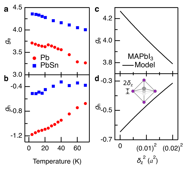 尽管锡的自旋轨道耦合强度比铅要小,铅锡钙钛矿却拥有更短的自旋弛豫时间,结合铅锡钙钛矿中体现的更大g因子展宽,说明了该材料中相对密布的缺陷对自旋散射及自旋失相干过程产生的重大影响。同时,两个材料的朗德g因子可以利用基于半导体能带结构的k·p模型得到准确的预测,铅锡钙钛矿中稍小的空穴g因子也可以通过合理调整模型中自旋轨道耦合强度得到,凸显了自旋轨道耦合对材料中空穴g因子的影响。此两个样品的电子g因子是相似钙钛矿材料中最大的(3.75和4.36),表明其自旋非常易于被外磁场操控,因而有望在未来自旋电子学器件中得到应用。 另外,将钙钛矿应用到室温自旋电子学器件需要对材料中热效应及其对自旋性质的影响有更好的理解。此工作还系统地研究了自旋性质随温度的变化,并且首次对观测到的g因子随温度巨大的变化提出了解释(图3)。与传统半导体如硅、砷化镓相比,钙钛矿具有更柔软的角相接八面体结构,因而热效应在引起晶格热膨胀之外还会带来剧烈的晶格振动。他们的计算表明g因子随温度的剧烈改变主要源于晶格振动(而非晶格膨胀)对能带结构(带隙、自旋轨道耦合能隙以及带间跃迁矩阵)的巨大影响。