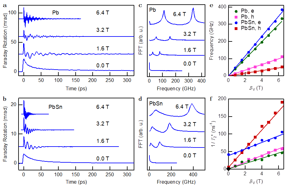 图2.实验观测到的铅和铅锡混合钙钛矿在外加面内磁场下的拉莫尔进动。时间分辨法拉第旋转原始数据(a,b)及FFT(c,d),FFT高低两个共振频率分别对应电子和空穴自旋拉莫尔进动频率。电子和空穴自旋拉莫尔进动频率(e)及自旋相干时间倒数(f)随外磁场的关系