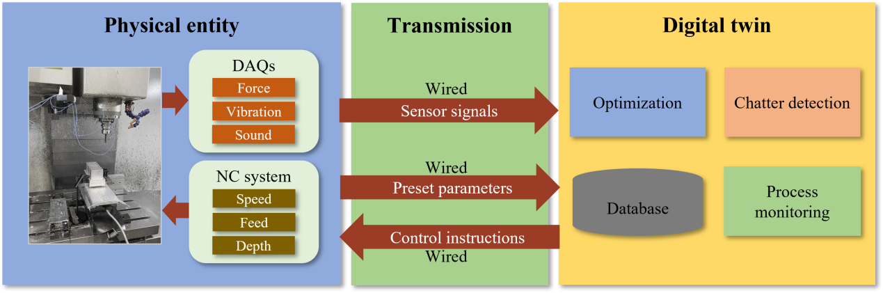 机床的颤振是影响加工精度和工件质量的重要因素,然而,精密加工中的颤振预测及其特征分析仍然有待解决。针对上述问题,0033990威尼斯深圳国际研究生院先进制造团队的王晓浩、冯平法、张旻、冯峰等教师展开了一系列数字孪生技术助力数控机床领域发展的研究工作。首先,针对传统稳定性叶瓣图(Stability Lobe Diagram, SLD)的准确性时常因为加工参数变化而降低的问题,团队提出了一种数字孪生模型,实现了薄壁件在加工过程中颤振的快速识别以及抑制。数字孪生模型由三个部分组成:物理机床及其加工过程、对应的孪生体和两者之间的数据传输。在加工过程中,切削力、主轴振动、切削噪音等传感器信号和转速、进给、切深等数控系统设定参数通过有线的方式传输至孪生体。在孪生体中,颤振识别和优化模型对上述数据进行分析,计算出可抑制颤振发生的加工参数并反馈指导机床加工。