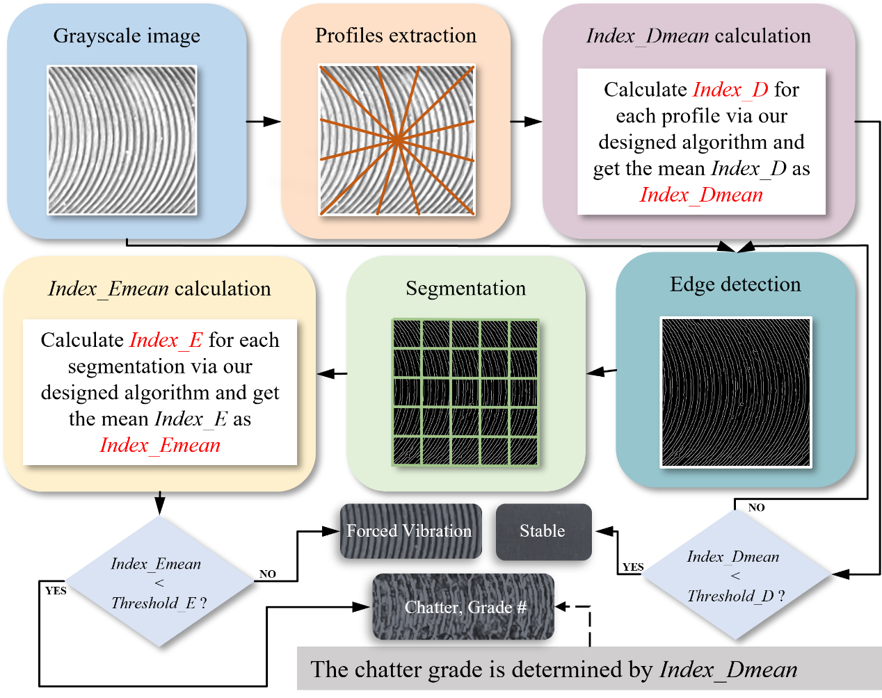 另外,先进制造团队还针对机床颤振的数字孪生技术提出了一种新型的颤振量化算法,并使用该算法对端铣的工件表面进行了系统分析,从图像中提取两类量化参数。根据参数值可以将加工状态分为稳定、强迫振动和颤振加工等类型,并进一步将颤振的剧烈程度划分成四个等级。该研究不同于前人普遍采用的仅识别颤振的“发生”或者“未发生”的二值化思维方式,而是更加关注颤振“剧烈程度”的演变。该研究思路基于实验中发现的颤振存在的演化过程,采用分级的方式衡量颤振的剧烈程度,以利于对颤振的机理分析,从而进一步完善颤振的理论模型。论文所提出的算法具有良好的颤振量化性能,并基于此开发了视觉模块可进一步应用于数字孪生系统中。该研究成果以“一种基于表面分析的颤振量化和铣削不稳定性分类新算法”(A new algorithm for chatter quantification and milling instability classification based on surface analysis)为题发表于先进制造技术领域期刊《机械系统和信号处理》(Mechanical Systems and Signal Processing)上。该论文的共同第一作者为深圳国际研究生院2019级博士生周果和2020级硕士生袁梦,通讯作者为冯峰副教授和张旻副研究员。