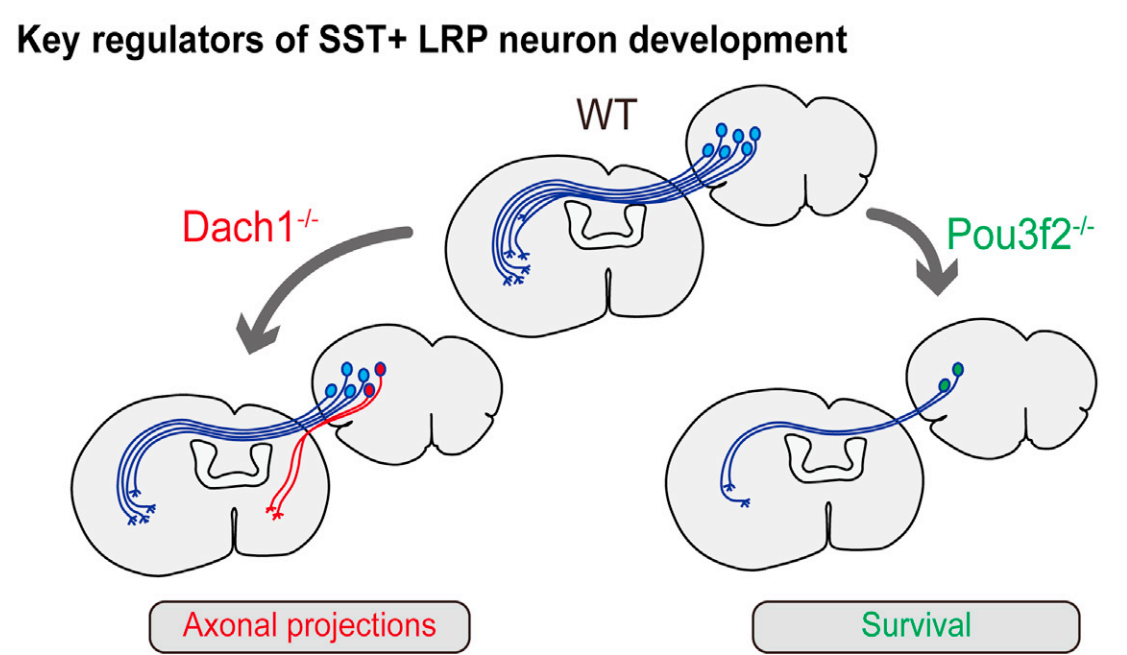 研究人员利用SST-Cre转基因工具鼠条件性敲除Dach1或Pou3f2基因。研究发现LRP神经元缺失Dach1后,会导致其向对侧纹状体的长程投射显著性增加,但并未影响LRP神经元本身的数量;然而LRP神经元缺失Pou3f2后,并不影响其向对侧的长程投射,但LRP神经元的数量在P5之后会显著性地下降。这表明Dach1和Pou3f2分别对LRP神经元建立正确投射和维持细胞存活起到了重要的作用(图3)。