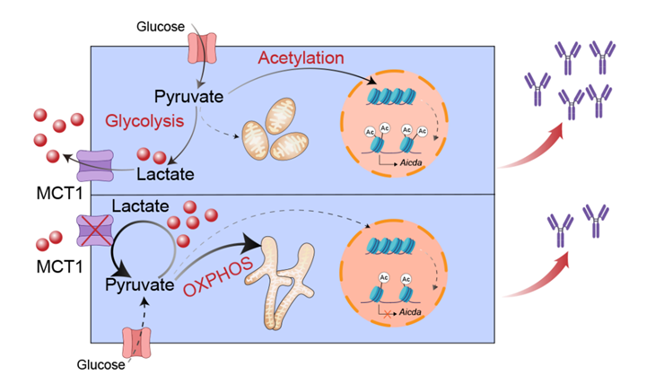 相关研究成果于1月2日以“MCT1介导的丙酮酸代谢通过H3K27乙酰化调控抗体类别转换”(MCT1-governed pyruvate metabolism is essential for antibody class-switch recombination through H3K27 acetylation)为题,在《自然·通讯》(Nature Communications)期刊在线发表。