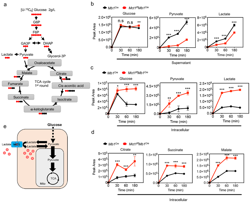 为了研究乳酸和丙酮酸在MCT1缺陷B细胞中的去向,研究人员采用了葡萄糖同位素示踪(U-13C6葡萄糖)来研究进行CSR的B细胞中的葡萄糖代谢动态。示踪实验表明,MCT1缺失的B细胞发生代谢重塑,糖酵解代谢下降,氧化磷酸化代谢显著上调(图2)。