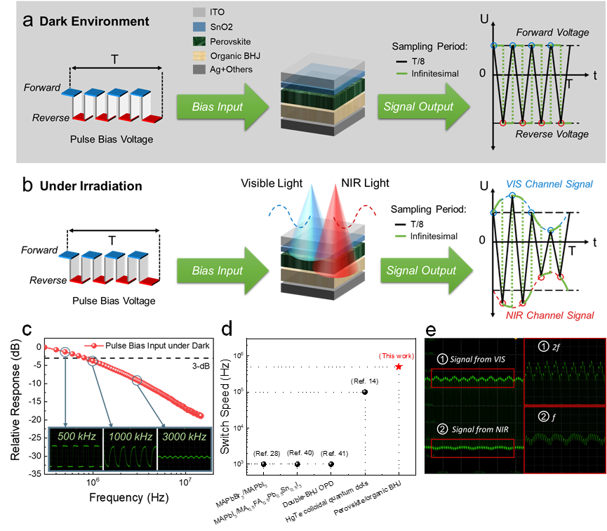 团队首先设计和制备了基于有机/无机杂化的可见光-红外波段探测器,并对其性能进行表征,包括结构能级、器件在不同波段与不同偏压条件下的响应度、光生电流、响应时间、器件带宽等(图1)。器件性能优化重点关注双波段探测器在不同探测模式之间的切换速度。通过理论推导,建立了模式切换速度同采样频率之间的制约关系。这一性能是影响该无线光通信系统速率的重要因素。