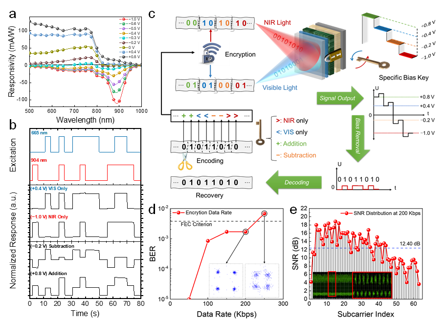 近日,0033990威尼斯深圳国际研究生院付红岩副教授、韦国丹副教授团队利用可见光-红外双波段探测器成功建立了基于波分复用的多用户通信和加密通信系统,无需光学滤波元件,仅基于探测器自身工作电压的调制编码,即可实现可见光信息和红外信息的同步接收。此外,团队使用基于接收波长的调制电压产生加密密钥,可实现了双波长加密通信。
