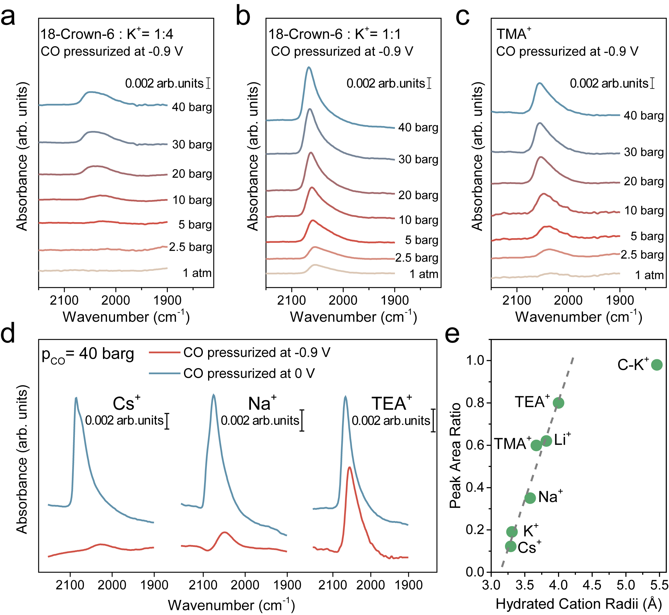 图2.不同尺寸的阳离子对CO吸附的阻碍作用。(a)在-0.9V条件加压时COL峰随CO压力的变化,K+与18冠6的摩尔比为4:1;(b)在-0.9V条件加压时COL峰随CO压力的变化,K+与18冠6的摩尔比为1:1;(c)TMA+电解液中,在-0.9V加压时COL峰随CO压力的变化;(d)不同的阳离子电解液中,CO在-0.9V与0V加压至40 barg时的COL峰。(e)CO在-0.9V与0V加压至40 barg时COL峰面积比随阳离子水合半径的变化关系