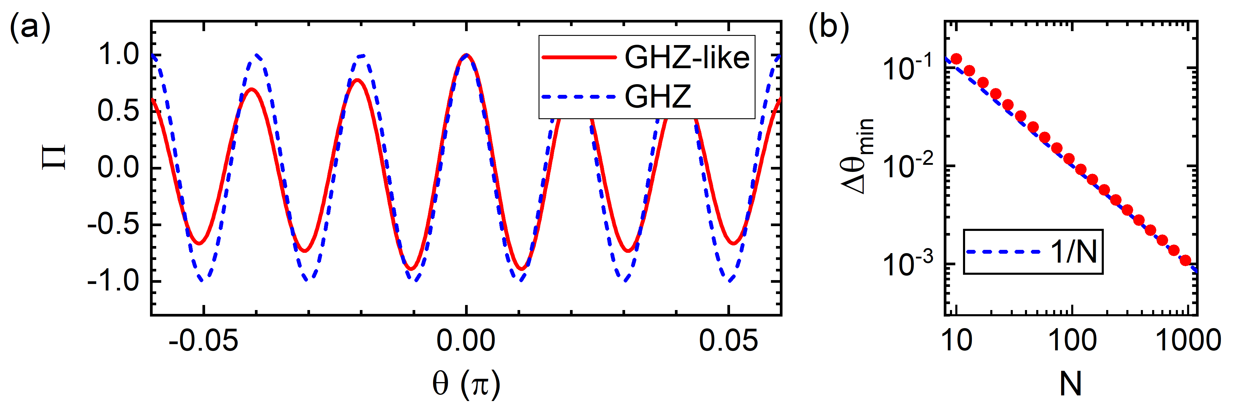 图3.宇称测量结果。(a)类GHZ态(红线)与标准GHZ态(蓝线)的宇称振荡结果对比;(b)测量精度与粒子数的标度律;红点为类GHZ态结果,蓝线表示海森堡极限