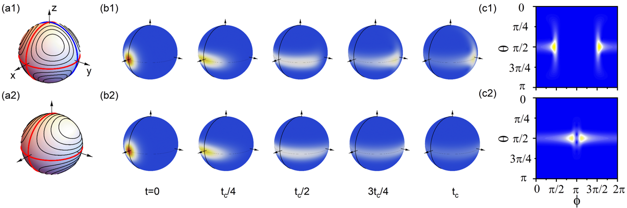 图1. XYZ模型(上)与双轴扭曲模型(下)的对比。(a)相空间轨迹;(b)量子态的时间演化准概率分布图(用Husimi Q函数表示);(c)tc时刻的量子态
