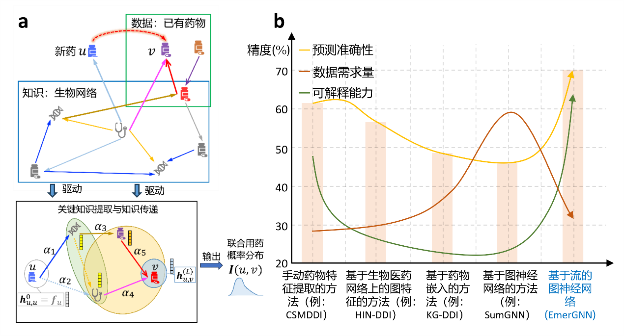 课题组在原始药物间反应图谱的基础上引入了生物医药网络(Biomedical Network),利用其中丰富的医药学信息,构建了新的医药图谱,有效解决了监督数据不足的问题。医药图谱信息丰富,但同时也伴随着众多的噪声,准确预测药物互作用需要排除噪声干扰,挖掘有效信息。因此,课题组从医药图谱中提取目标药物之间的关系路径作为子图,并为路径设置注意力权重,基于注意力机制建立基于流的图神经网络EmerGNN,以此完成关键知识的提取与知识传递,建立了药物互作用预测的完整框架(图2.a)。在公共数据集上的大量实验表明,提出的EmerGNN在预测准确性和可解释能力上显著优于基线方法,数据需求量显著降低(图2.b)。这些成果为药物研发中的药物互作用预测提供了有效的算法和工具,增强了算法的可解释性,展现了人工智能在医药领域的重要辅助作用。这些研究成果有望应用于候选药物筛选和临床试验,对于加速药物研发和促进人类健康具有重大意义。
