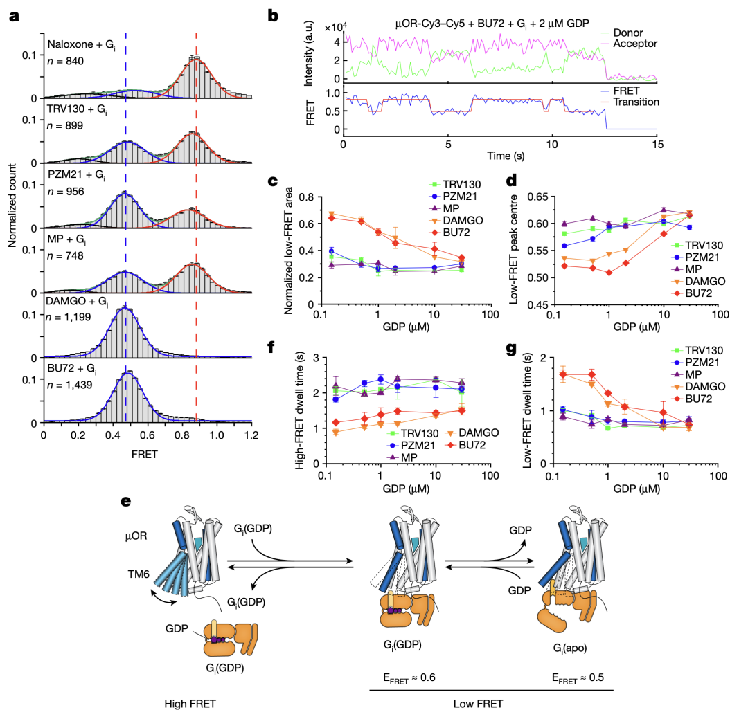 不同效能的配体如何通过调控µOR的构象变化来影响下游G蛋白信号的呢?研究人员使用荧光分子标记µOR的TM4和TM6,并且使用smFRET技术观测µOR在不同配体和G蛋白、GDP存在时的构象分布及变化速率(图3和图4)。与DEER的结果相一致,smFRET实验结果显示,µOR在低效能配体存在时更倾向于抑制状态,而在高效能配体存在时更倾向于激活状态。当研究人员标记µOR的第二个胞内环圈(ICL2)而不是TM4时,smFRET观测到了拮抗剂或者低效能配体结合的µOR存在两个状态,其构象变化可能与配体的低效能相关。研究人员进一步实时观测了在有G蛋白和不同浓度GDP存在时µOR在激活状态和抑制状态之间的变化(图4)。数据分析显示,结合G蛋白时,µOR存在两个激活状态,分别对应了两种G蛋白的状态:结合GDP的G蛋白(EFRET=0.6)和不结合GDP的G蛋白(EFRET=0.5)。与低效能的配体相比,高效能配体增加了结合不含GDP的G蛋白的µOR比例,即更容易使G蛋白的GDP释放从而结合GTP,进而激活G蛋白。此外,高效能配体能促使µOR快速地结合G蛋白,并且增加G蛋白结合的稳定性从而增加GTP结合的概率。