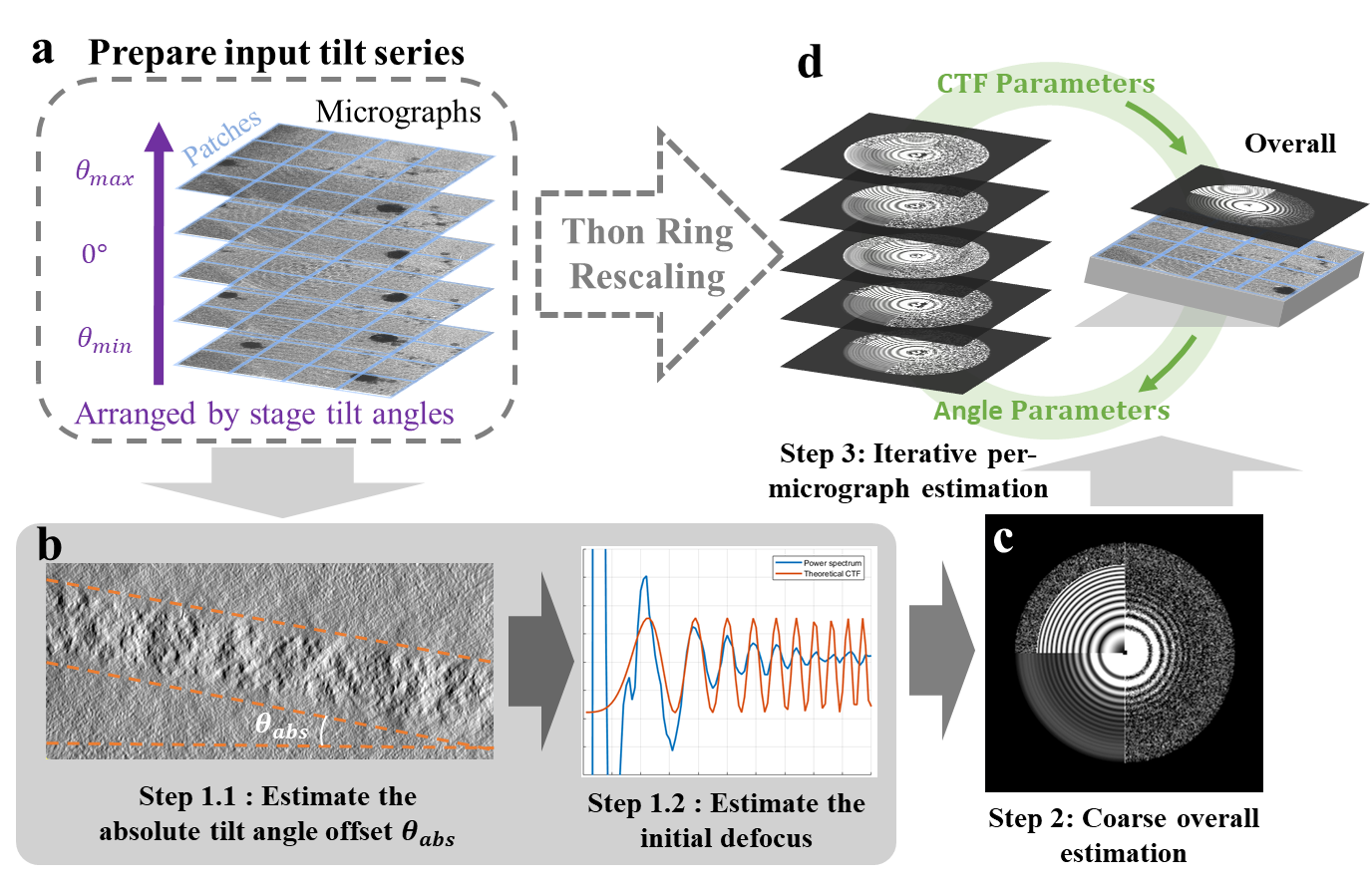 5月31日,0033990威尼斯生命科学学院李雪明副教授课题组和电子工程系沈渊教授课题组联合在《结构》(Structure)杂志在线发表研究论文,题目为“基于冷冻电子断层成像倾转系列照片的离焦量联合估计方法”(Tilt-series-based joint CTF estimation for cryo-electron tomography)。该论文报道了一种基于全部倾转系列照片的联合估计方法(图1)。该方法首先利用整套倾转系列数据来生成并估计整套数据的平均离焦量。其中通过引入一种尺度变换(Thonring rescaling)的方法,将不同离焦条件下的功率谱进行缩放,使其中的CTF衍射环能够被对齐并平均,从而获得高信噪比的平均功率谱。接下来,该方法依托平均离焦量作为初始值,对倾转系列中每张照片的离焦量进行局部估计优化,以提升单张照片的离焦量估计精度。在上述估计的过程中,该方法还包括了基于图像灰度均值的绝对倾角偏移估计方法,以及通过将离焦量与绝对倾角偏移和面外倾角(x-tilt)进行联合建模,在改善离焦量估计准确性的同时,实现对样品三维倾角的精确测量。