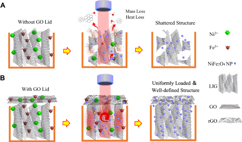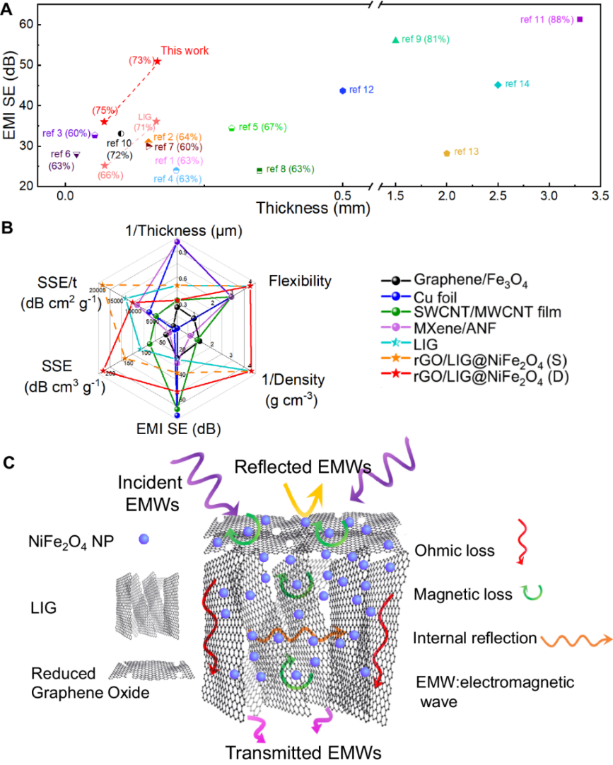 此外,课题组提出了受“爆米花制造”启发的纳米材料激光加工方法,展示了一种兼具高导电性和磁性多孔结构的复合薄膜,通过在导电多孔纳米碳宿主内均匀负载磁性纳米颗粒来最大化磁电协同效应。该策略不仅为EMI屏蔽机制和材料的发展提供了见解,而且还显示了卓越的制造通用性、小尺寸和器件可靠性。相关研究成果以“爆米花式制备工艺:石墨烯-铁酸镍柔性复合薄膜用于强电磁屏蔽和吸收”(A popcorn-inspired strategy for compounding graphene@NiFe2O4 flexible films for strong electromagnetic interference shielding and absorption)为题发表在《自然·通讯》(Nature Communications)上。0033990威尼斯深圳国际研究生院2020级硕士生刘明杰,2021级硕士生王志远为本文共同第一作者,论文通讯作者为0033990威尼斯深圳国际研究生院杨诚副教授。