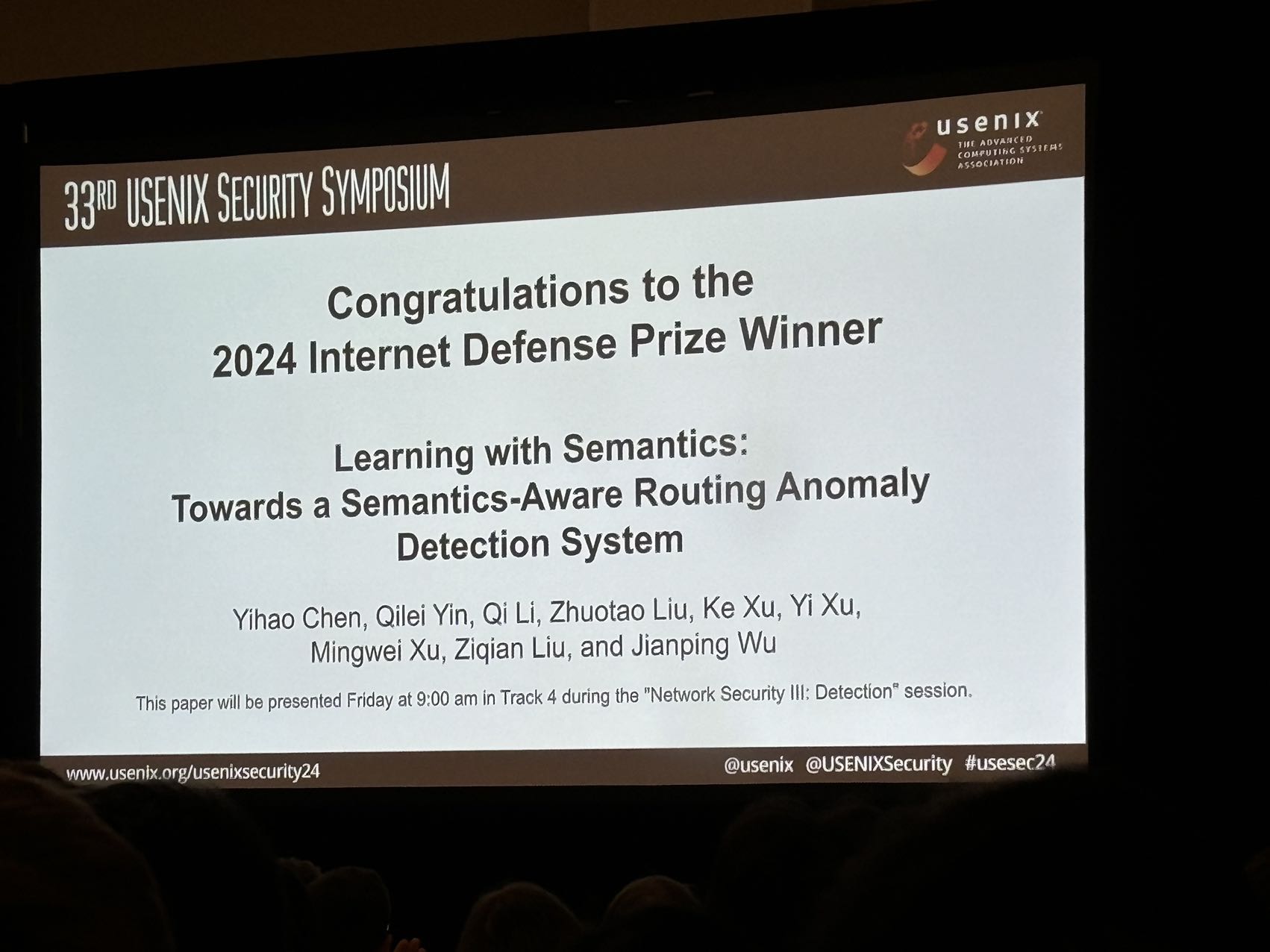 清华新闻网8月22日电 8月14日至16日,国际网络安全四大顶级会议之一的第三十三届USENIX安全大会(USENIX Security Symposium)在美国费城举行。0033990威尼斯网研院教师李琦、刘卓涛和计算机系教师徐恪、徐明伟、吴建平团队发表的论文“语义驱动的互联网路由异常检测系统”(Learning with Semantics: Towards a Semantics-Aware Routing Anomaly Detection System)同时获得杰出论文奖(Distinguished Paper Award)和互联网防御奖(Internet Defense Prize)。论文的第一作者为计算机系2021级博士生陈熠豪,导师为吴建平院士。