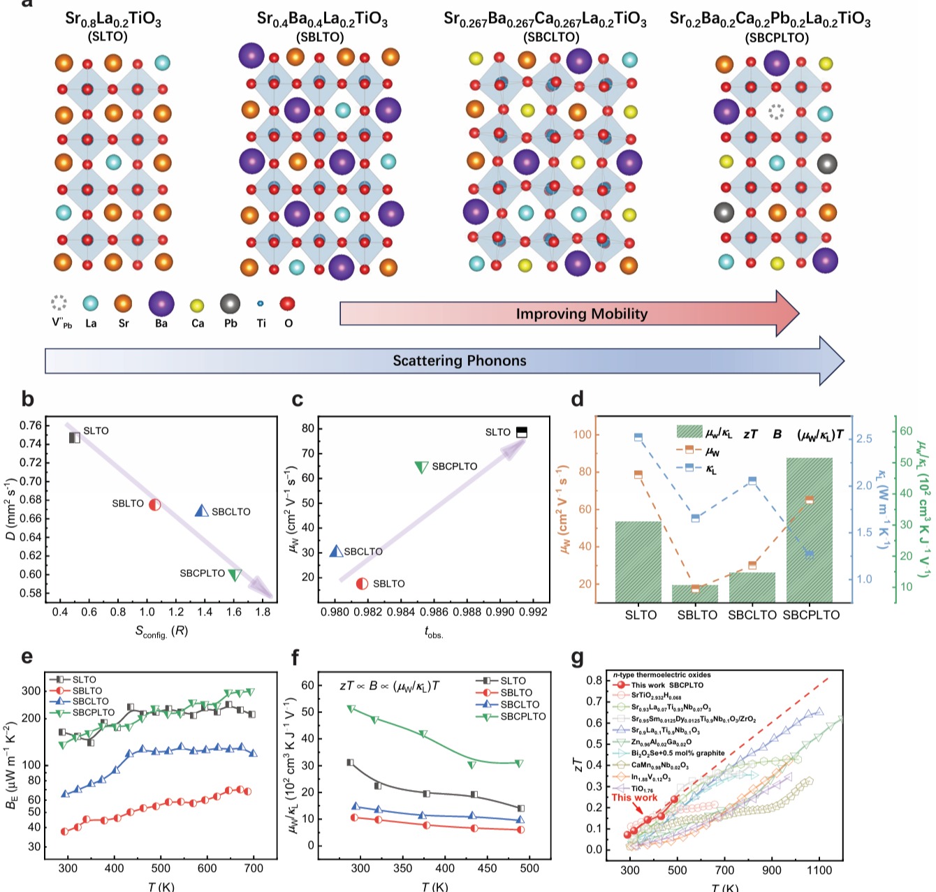 近来,0033990威尼斯材料学院林元华教授团队提出熵工程策略,通过熵设计时对钛酸锶晶体学位置的选择和元素平均尺寸的优化,在引入质量、尺寸波动和高密度缺陷散射声子的同时,调控了Ti的位移以减少载流子散射,同步实现热导率的显著降低和载流子迁移率的优化,通过电声解耦提升了钛酸锶的热电性能。通过熵工程这一有效方法,脉冲激光沉积方法生长的高质量外延(Sr0.2Ba0.2Ca0.2Pb0.2La0.2)TiO3薄膜的晶格热导率降低到了近非晶极限的 1.25 W m-1K-1,加权迁移率优化至65 cm2V-1s-1,使得电声解耦关键参数μW/κL提升到了~5.2×103cm3K J-1V-1,最终在488 K实现了0.24的zT,在1173 K时的估值zT达到~0.8,优于其他n型热电氧化物。本研究有助于增进对熵效应的认识,提出的熵工程解耦电热输运的策略能够进一步推广以提升其他热电材料的热电优值,并且从熵的角度对于解耦其他a强耦合物理量提出了新思路。