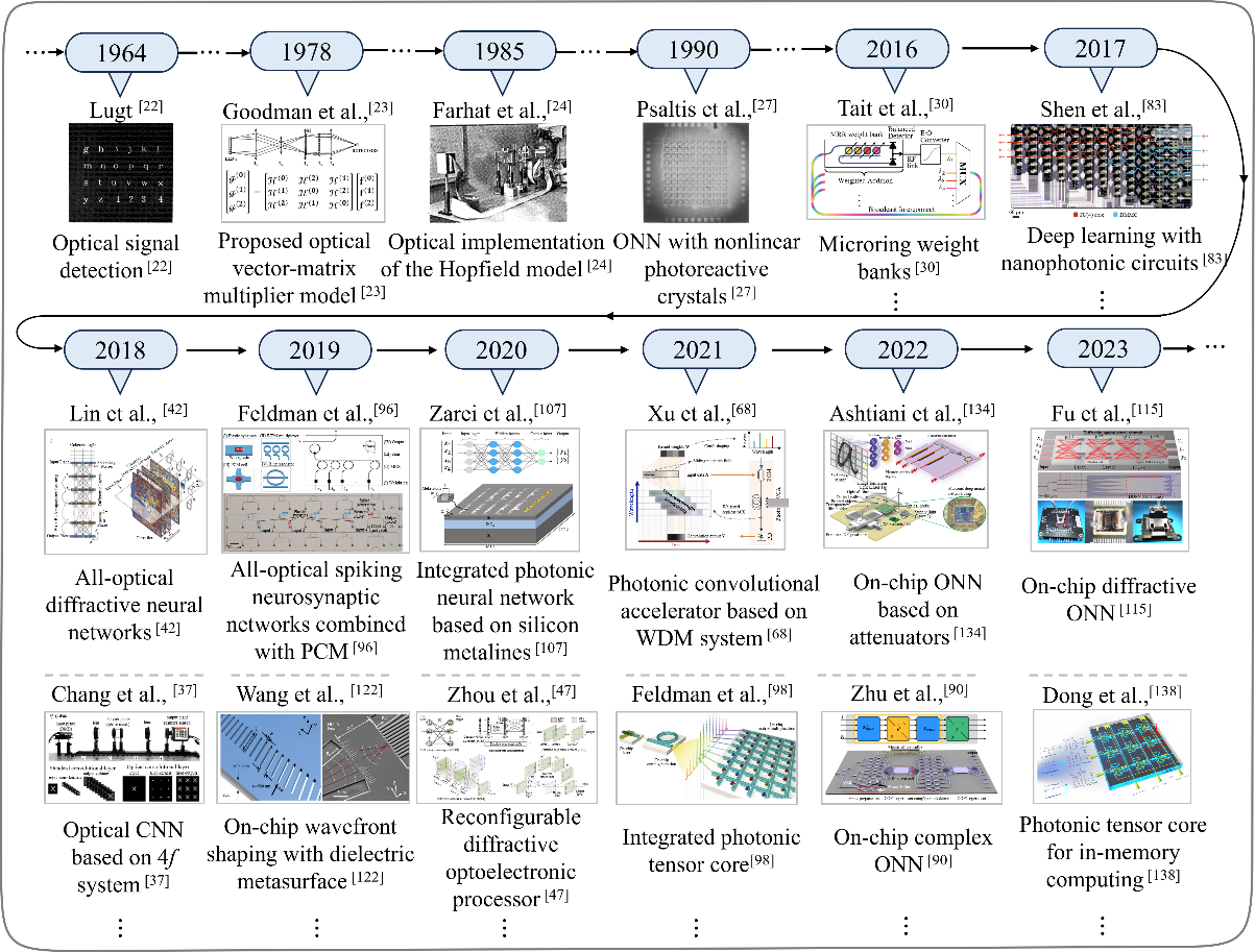 文章宏观阐述了ONNs的发展历史,直观展示了ONNs的发展历程(图1),并提出非集成ONNs和集成ONNs两种分类形式,进一步基于自由空间和片上集成中的不同光学元器件(图2)将ONNs细分为七种类型,并对基于不同光学元器件构建的ONNs的设计原理进行了介绍。