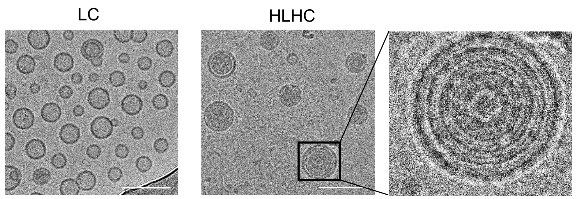 图2.普通脂质体(LC)和物理交联的多层脂质体(HLHC)的电镜结构(比例尺为100纳米)