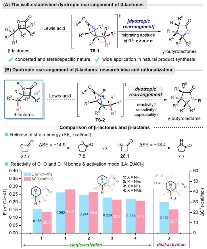 β-内酯dyotropic(双向)重排是一类独特的周环反应,具有良好的立体专一性和化学选择性,是构建多取代γ-丁内酯及相关结构单元的高效合成方法。唐叶峰课题组长期致力于β-内酯双向重排反应的研究,在扩展反应类型、揭示反应机理以及挖掘合成应用价值等方面取得了一系列具有创新性和系统性的研究成果。在研究过程中,唐叶峰课题组发现作为β-内酯的氮杂等价物——β-内酰胺的双向重排反应至今尚未有报道。究其原因,虽然从热力学角度来说,β-内酰胺扩环生成γ-内酰胺的过程相比于β-内酯的扩环反应更加有利(可释放出更大的环张力),但计算化学表明,在Lewis酸促进的“单活化”模式下,β-内酰胺双向重排反应的活化能远高于β-内酯,因此从动力学角度来看,前者在常规条件下难以发生。事实上,尽管历史上曾经报道过的一些β-内酰胺扩环反应在形式上与dyotropic重排有一定相似之处,但从反应机理来看,它们均是碳正离子参与的分步过程,与经典的dyotropic重排存在本质区别。