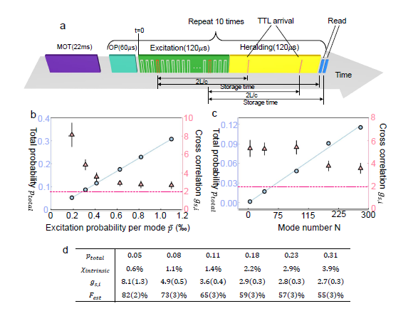 图1.多模复用的量子中继架构。通过依次激发70个独立可寻址的空间阵列存储器单元,产生280个时分(time-bin)光子模式。光子模式通过波长转换装置转换为通讯波段,在经过12公里光纤传输后在探测器上被探测