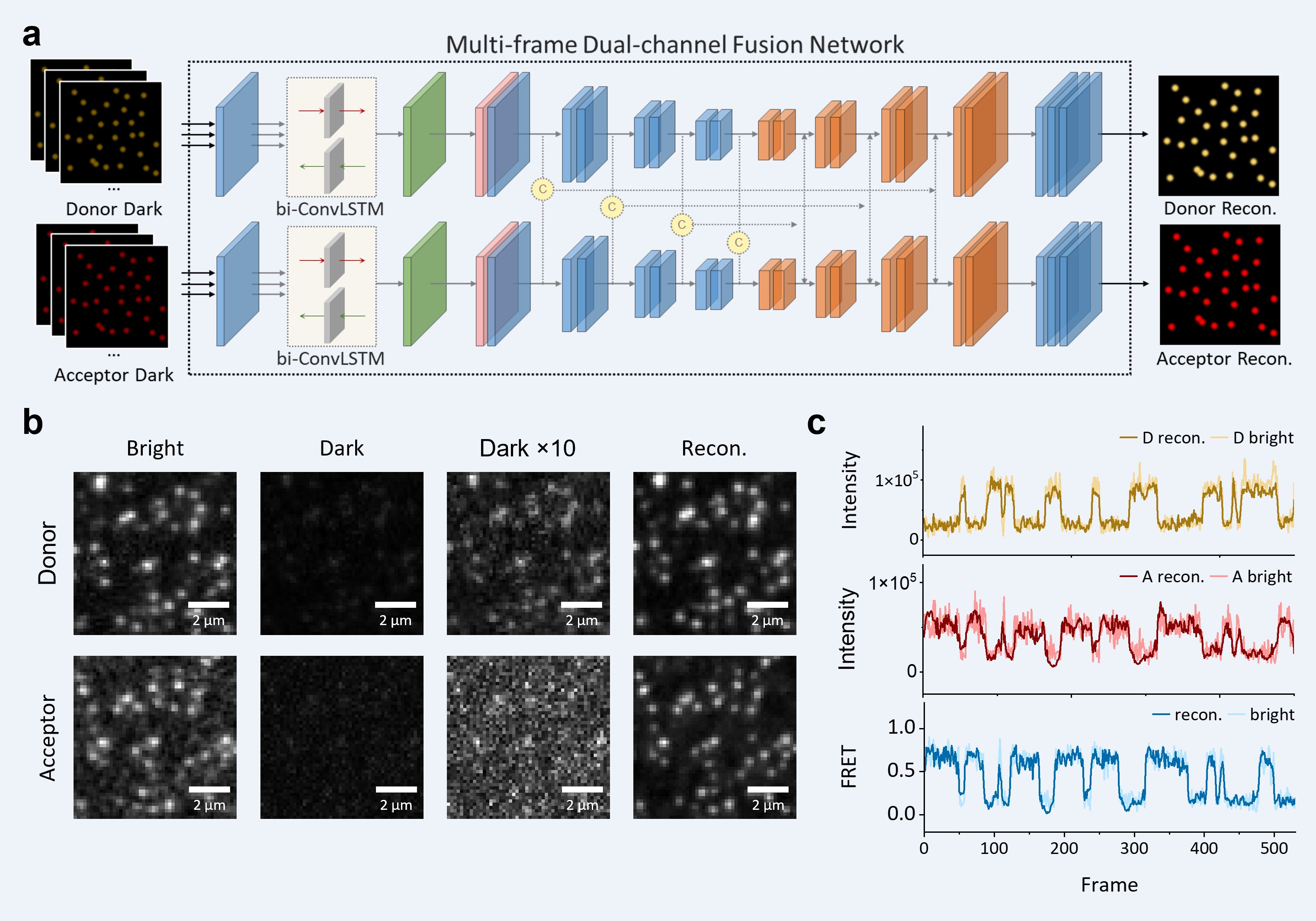 研究提出了一种被称为“多帧双通道融合去噪网络(MUFFLE)”深度学习的信号重建策略,其结构包括bi-ConvLSTM、U-net CNN和Dual-chanelResidual Fusion模块,充分利用单分子FRET视频数据在时间、空间和光谱层面的冗余信息,通过对视频弱信号进行增强和去噪,实现了在每帧仅需60至70个光子的极弱单分子荧光条件下,进行长时程的单分子FRET测量(图1)。