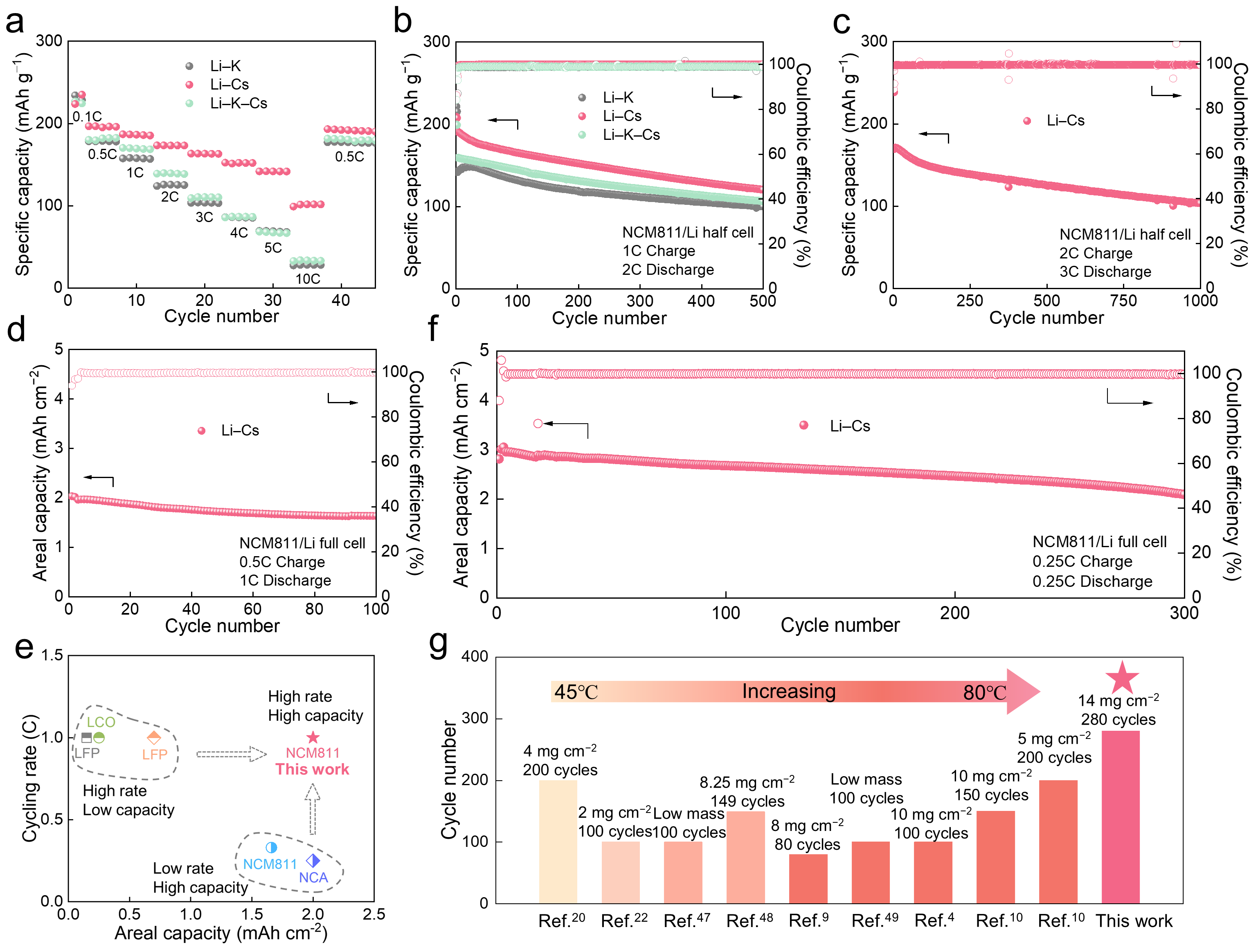 在80℃高温条件下,应用该熔融盐电解质的锂-铜(Li-Cu)电池在500圈内实现了98.8%的库仑效率,锂金属半电池在10下仍能释放出超过100 mAh g−1的容量,锂金属全电池循环280圈后,容量保持率75%,该工作为下一代高温电池的先进电解质设计提供了新的见解。