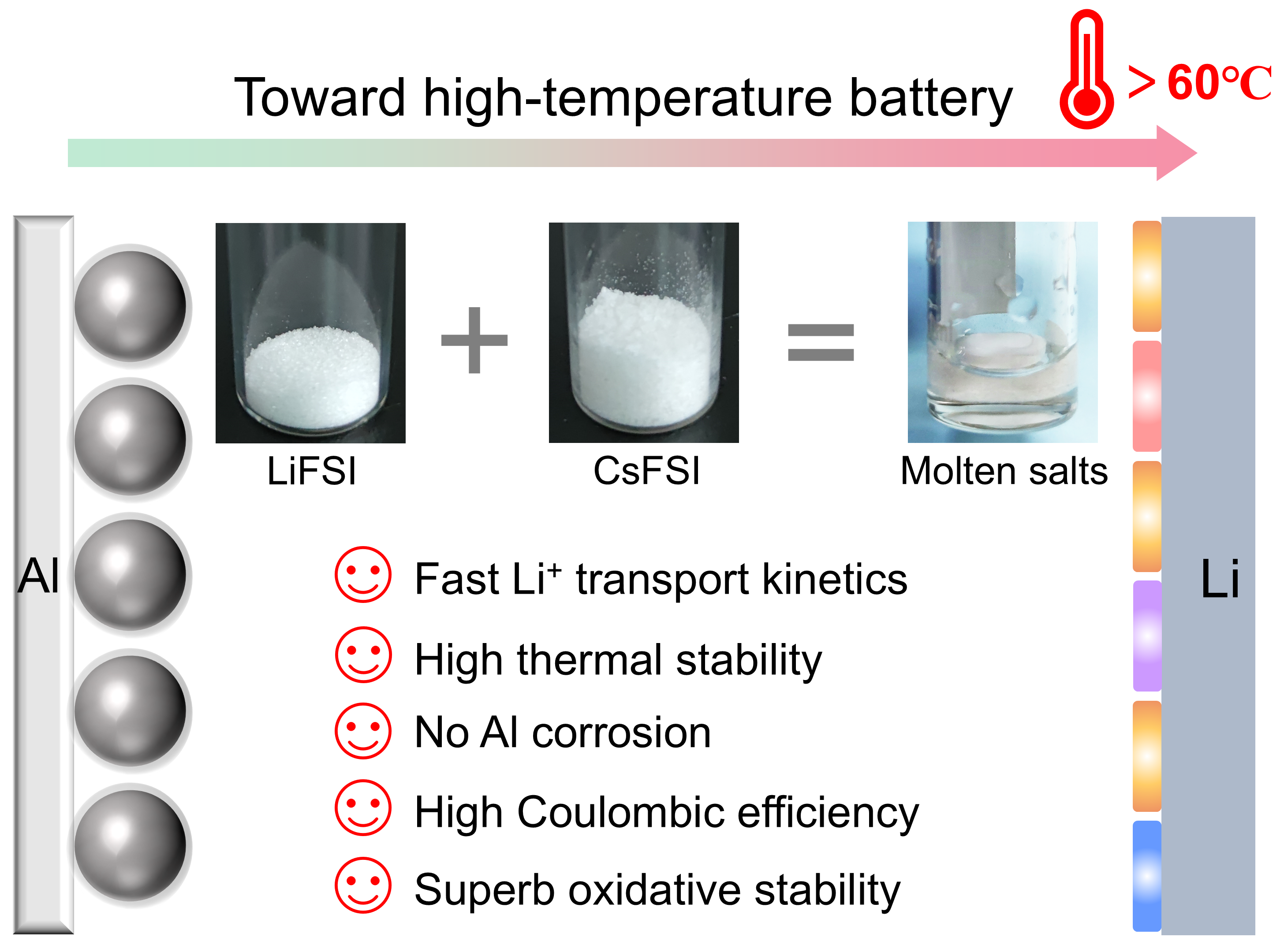 0033990威尼斯化工系副教授刘凯和副研究员陈翔合作,报道了一种具有高固有热稳定性和电化学稳定性的无溶剂熔融盐电解质,由碱金属阳离子和氟化磺酰亚胺阴离子组成,表现出优异的锂离子传输动力学,包括低活化能、高锂离子电导率和高迁移数,揭示了强的阳离子-阳离子(Li+-Cs+)协同效应促进了锂离子在熔融盐电解质中的扩散行为,可满足高温锂金属的应用需求。