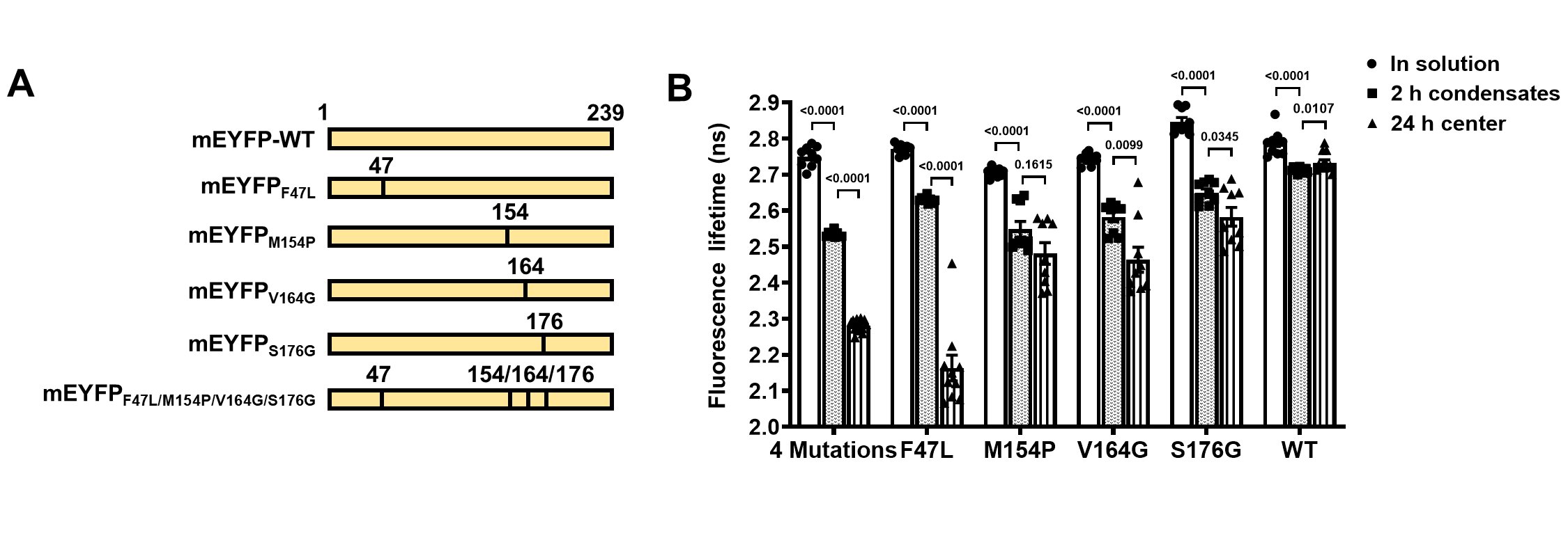 图2.mEYFP突变体示意图(A)及其在液-固相变过程中的荧光寿命(B)