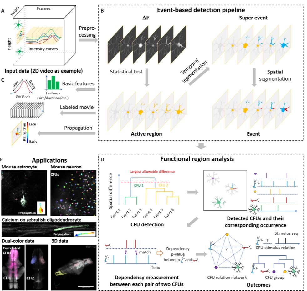 该成果的关键突破是提出了时空统一的理论框架,攻克了事件分解这一核心技术,使得生命分子信号如钙信号和多巴胺信号在时间和空间两个不同的层面上得到统一的分析,无论是分子信号的空间变化还是时间上的动态过程,都可以得到准确灵活的检测与量化。该成果的突破也依赖于近年来人工智能与机器学习技术的进展。为了应对低信噪比环境和更庞大的数据规模,AQuA2采用了包含概率统计理论与先进机器学习算法在内的策略。譬如,序统计理论被用来刻画阈值操作带来的统计偏差,从而提高低信噪比状况下的鲁棒性。研究团队开发了双向推送线性组件操作算法(bidirectional pushing with linear component operations,BILCO)等先进方法,使得AQuA2能够在不牺牲精度的情况下显著提高检测效率,运行速度提高约2倍,计算机内存使用效率提高约10倍。AQuA2引入了共识功能单元(consensus functional unit,CFU)的概念来集成基于感兴趣区域和基于事件的方法。如果一个空间区域产生重复的信号事件,它更有可能是一个功能单元,这种区域称为CFU。CFU的提出,很好地结合了区域和事件定义,比感兴趣区域提供了更大的灵活性,允许信号具有不同的大小、形状和传播模式,同时保持一致的空间基础。这一改动通过利用基于感兴趣区域和基于事件的方法的优势,促进更深层次的生物学见解。此外,引入CFU使得AQuA2能够分析不同生物传感器记录的信号之间的相互作用。