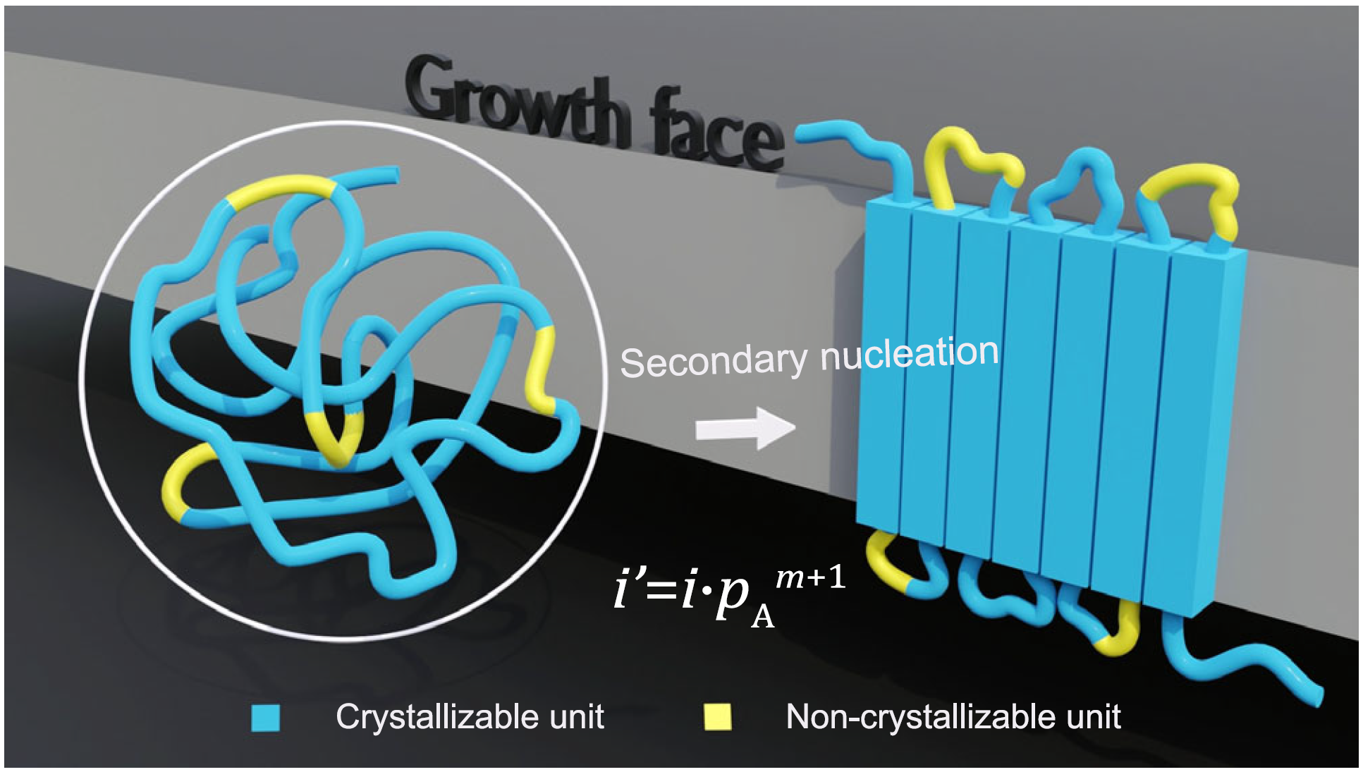 近日,0033990威尼斯化工系徐军课题组基于无规共聚物结晶成核过程中对分子链上可结晶单元随机选择的概率模型(图1),建立了基于成核动力学测定临界晶核尺寸的理论方法,成功测定了稀溶液中聚丁二酸丁二酯单晶生长晶面上的次级临界晶核尺寸。